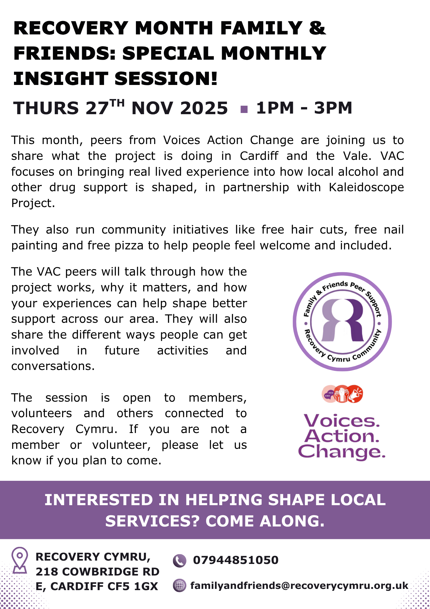 - Thursdays (1pm-3pm): Family & Friends: Insight Sessions. Every last Thursday of the month at the Recovery Centre.